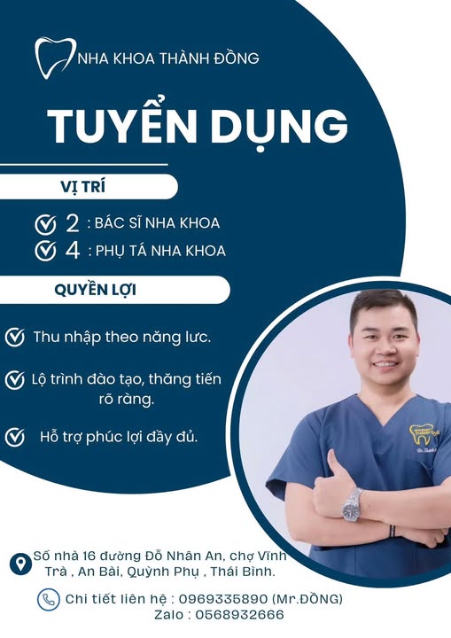 - 📍 Làm việc tại: Nha khoa Thành Đồng- Số nhà 16 đường Đỗ Nhân An, chợ Vĩnh Trà , An Bài , Phụ Dực , Hưng Yên